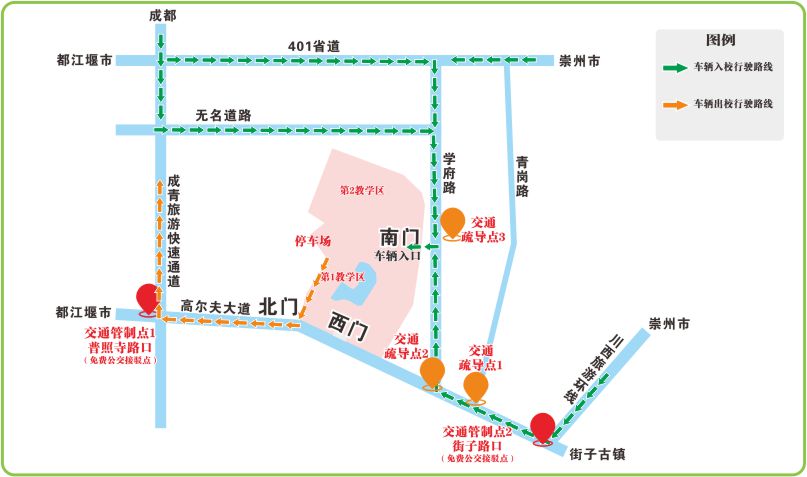 四、配合交通疏导:学校门口道路(高尔夫大道)预计将于7:20左右根据车流量实施临时管控。若因交通管制无法驾车直达,考生可选择在“普照寺路口”“街子古镇”管制点换乘102路摆渡公交车前往学校(出示准考证可免费乘坐)。