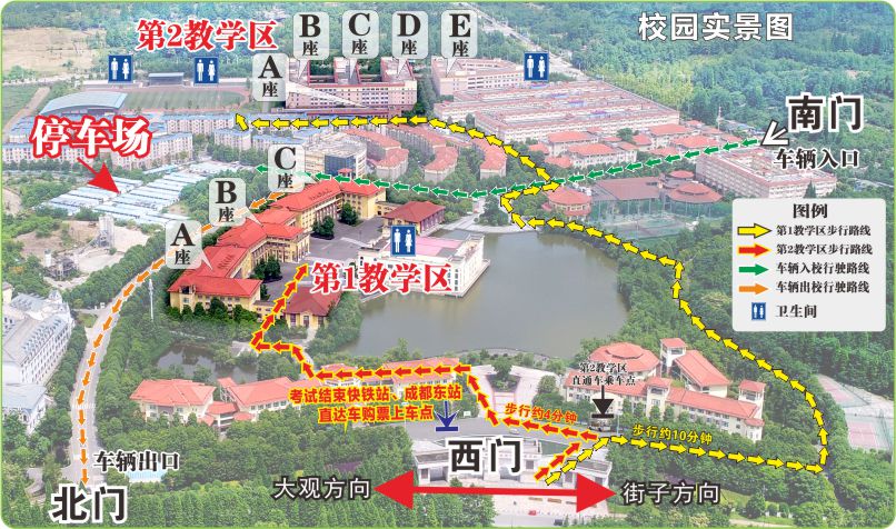二、交通提示:考试恰逢周末,属出行高峰期。乘坐快铁、长途大巴等公共交通的考生,请提前购买往返车票,避免临时无票耽误行程。建议使用导航APP查询实时路线,选择最优出行方案。乘坐公共交通的考生从学校西门凭准考证入校。校内西大门处有直达成都东站和青城山高铁站的直通车,考试结束后可前往学校西门乘坐。
